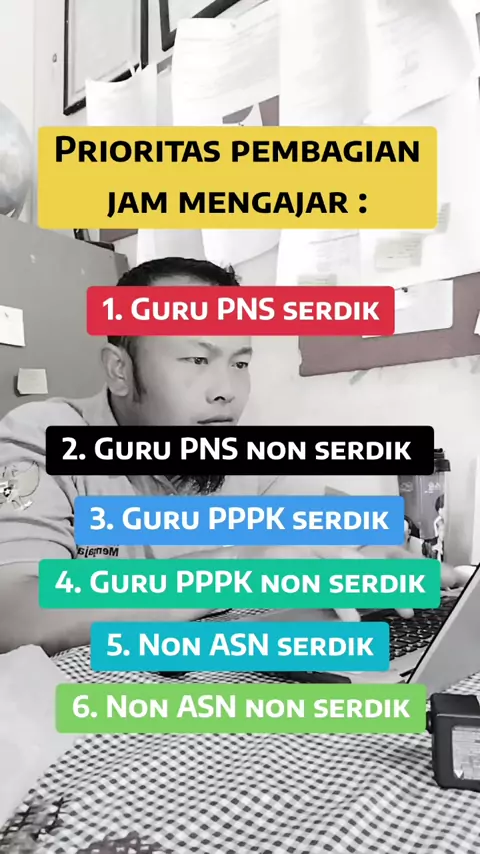 Prioritas pembagian jam mengajar: 1. Guru PNS serdik 2. Guru PNS non serdik 3. Guru PPPK serdik 4. Guru PPPK non serdik 5. Non ASN serdik 6. Non ASN non serdik #fbpro #infoguru #gurusd #fyp #gurukelas