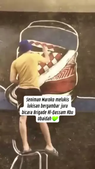 نشطاء مغاربة يرسمون لوحة تحمل صورة الناطق باسم كتائب القسام أبو عبيدة، خلال فعالياتهم المناصرة لفلسطين والمقاومة. Seniman Maroko melukis lukisan bergambar juru bicara Brigade Al-Qassam Abu Ubaida, selama aktivitas mereka mendukung Palestina dan perlawanan. #FreePalestine #abuubaidah #jubiralqasam