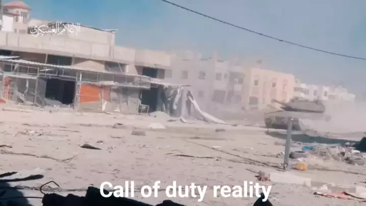 Adegan Mujahidin Al-Qassam menargetkan kendaraan pendudukan dan tentara yang menembus wilayah kota Khan Yunis, selatan Jalur Gaza. #muslimfamily