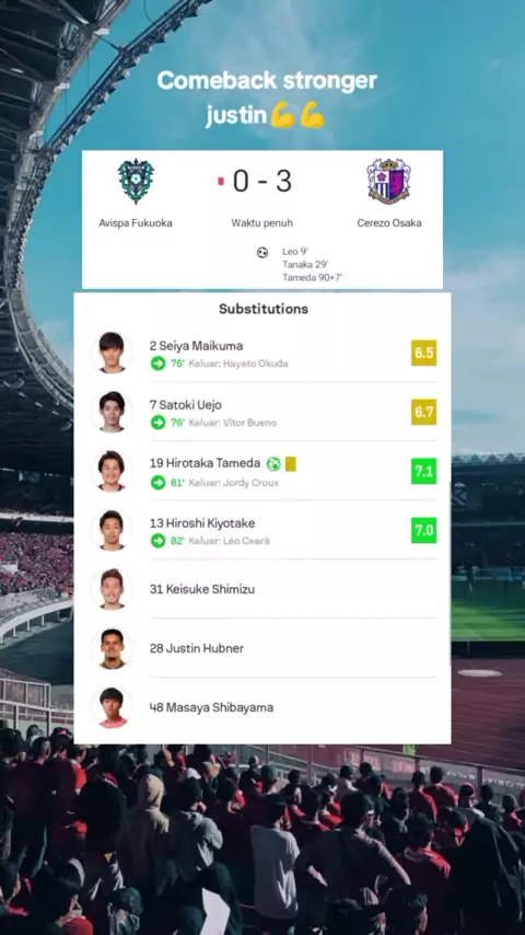 Cerezo Osaka menang 3-0 di kandang Avispa Fukuoka! Justin Hubner berada di bench, namun tak dimainkan pada laga kali ini. Cerezo Osaka memainkan Ryuya Nishio (timnas Jepang U23) dan Koji Toriumi di posisi bek tengah. Laga selanjutnya Cerezo akan main di kompetisi Cup ketemu tim divisi 3, biasanya ada rotasi untuk kompetisi Cup, mungkin Hubner akan dimainkan pada laga ini. Tapi semua keputusan pelatih & harus dihargai. Sebagai netizen kita nikmati aja dengan bijak, gak perlu tantrum apalagi sam...