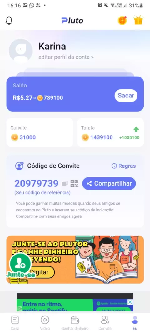 20979739 Esse é meu código de convite. Aplicativo Pluto. Paga no PIX #RENDA EXTRA #PAGA NO PIX #CODIGO CONVITE