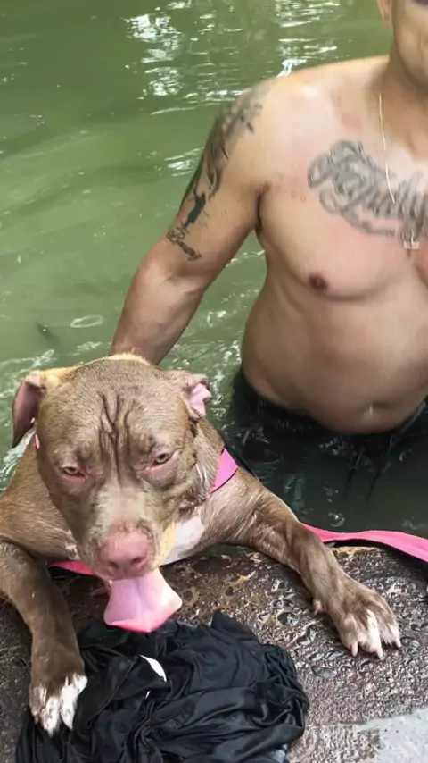 Esmeralda pulou na água e saiu nadando 🤭🤭🤭. Parte2 já comenta muito pra parte 03. 🥰. #ComédiaAnimal #pitbull #aventura #sejacriador