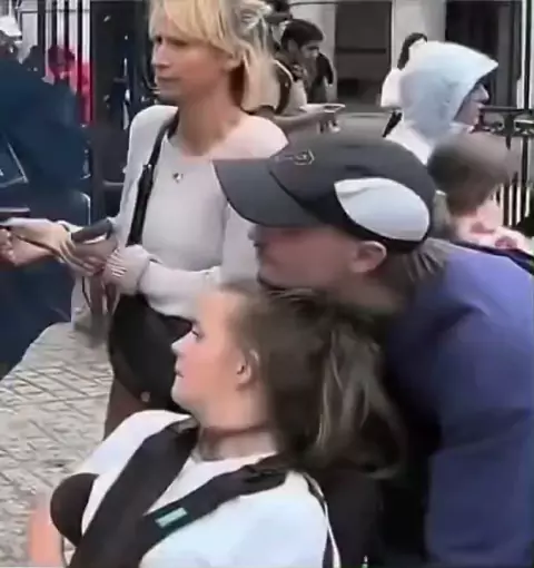 O Guarda Real guia seu cavalo para mais perto de uma turista especial.