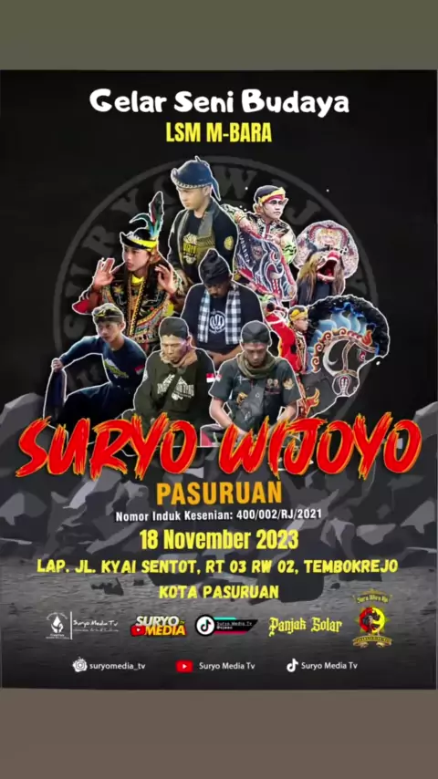 Kita hadir lagi tanggal 18 yah Yuk ramaikan. Siap meriahkan acara gelar seni budaya di tembok rejo.#゚viral#pasuruan#kesenianjawa#budayajawa#suryomediatv#creativejavaneseculture#pasuruanjawatimur#barongan#jaranan#suryowijoyo#baronganjawatimur#jawatimur#kesenianjawatimur