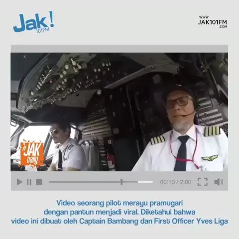 Video aksi pilot yang merayu sejumlah pramugrari dengan pantun lucu menjadi viral. Nggak cuma pilot , aksi dari First Officer juga membuat video tersebut semakin lucu. Diketahui bahwa nama pilot tersebut adalah Captain Bambang Hartoko dan First Officer Yves Liga Pangeran Hakim. • • Video itu dibuat saat pesawat tidak terbang. Pembuatan video itu juga murni kreativitas pilot dan kopilot serta tidak mengganggu keselamatan. • • #JAKDAILY #pilotpantun #jak101fm #jakfm