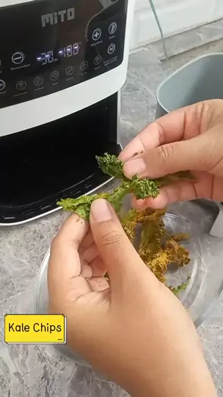 Kale Chips. Lupa ada daun Kale dikulkas, pas dibuka sudah mulai menguning, cus eksekusi. Bahan - daun kale - garam - lada - olive oil (saya ganti minyak wijen) Langkah-langkah, tiriskan - cuci daun kale - taruh diwadah, taburi garam + lada + minyak sayur / sesuai elera - panggang 180°C selama 15 menit #kale #chip #bynmy #daunkale #kalechips recipe / resep / air fryer / kale chips panggang / oven / snack / vegetable chips / healthy snacks / green veggie