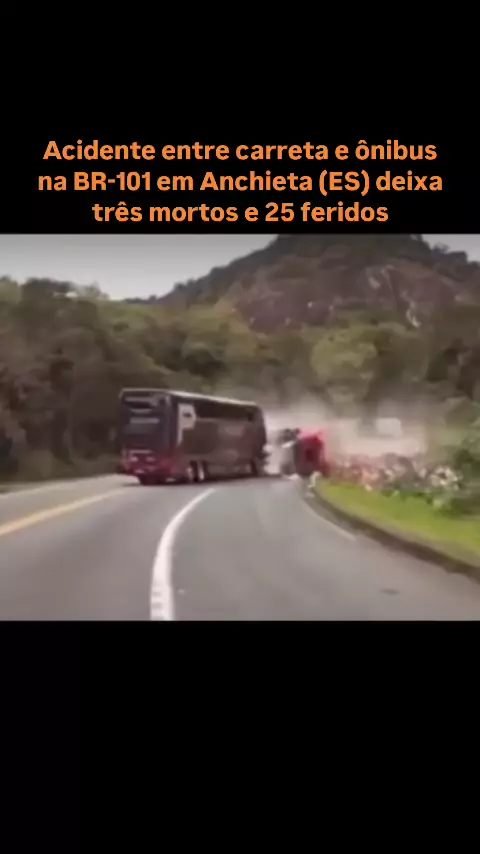 TURISTAS VOLTAVAM DE RAPOSO. Uma câmera que estava em um veículo flagrou o momento exato do acidente entre um ônibus e uma carreta na BR 101 em Anchieta-ES. O acidente teve três vítimas fatais,todas elas estavam no ônibus,entre elas o motorista. 0 ônibus voltava de Raposo-RJ e estava indo sentido a Grande Vitória. Já a carreta estava carregada de mamão. 0 motorista da carreta fez o teste do bafômetro q deu negativo que descartou a possibilidade de ele ter ingerido algum tipo de bebida alcoólica