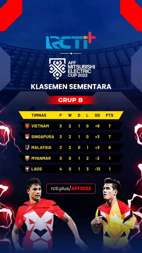 Persaingan untuk lolos ke babak semi final di grup B juga ketat! Siapa yang akan lolos? Dapatkan informasi lengkap AFF 2022 cuma di RCTI+ atau kunjungi rcti.plus/AFF2022#AFFMitsubishiElectricCup2022#AFF#AFFCUP#AFFCUP2022