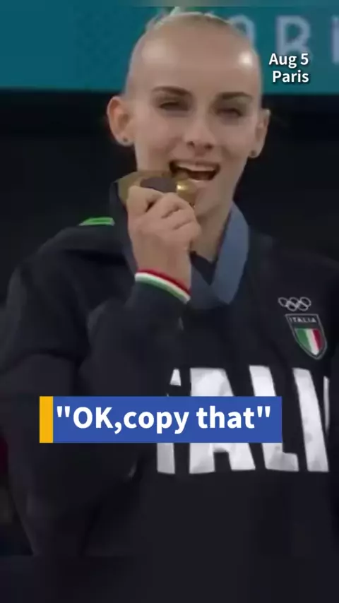 Desculpe, sou novo aqui... o jovem ginasta chinês Zhou Yaqin ganhou a medalha de prata na final da trave de equilíbrio. Ela logo seguiu a tradição da mordida da medalha depois de ver os ginastas italianos A. D 'Amato e M. Esposito fazê-lo. um momento fofo e inestimável # engraçado # esportes # Paris # Olimpíadas # ginástica # goldmedal #