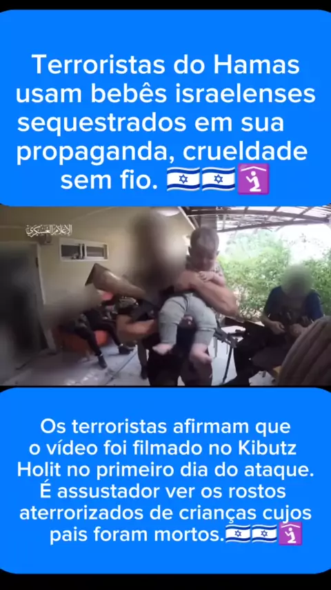 Terroristas do Hamas usam bebês sequestrados em sua propaganda. Os terroristas afirmam que o vídeo foi filmado no Kibutz Holit no primeiro dia do ataque. É assustador ver os rostos aterrorizados de crianças cujos pais foram mortos diante dos seus olhos pelos terroristas. Estas crianças estão agora nas mão destes monstros do Hamas como reféns e escudos humanos. Fonte: NEXTA. #forcaisrael #escudoeflecha #HamasisIsis #HamasNazis #israel