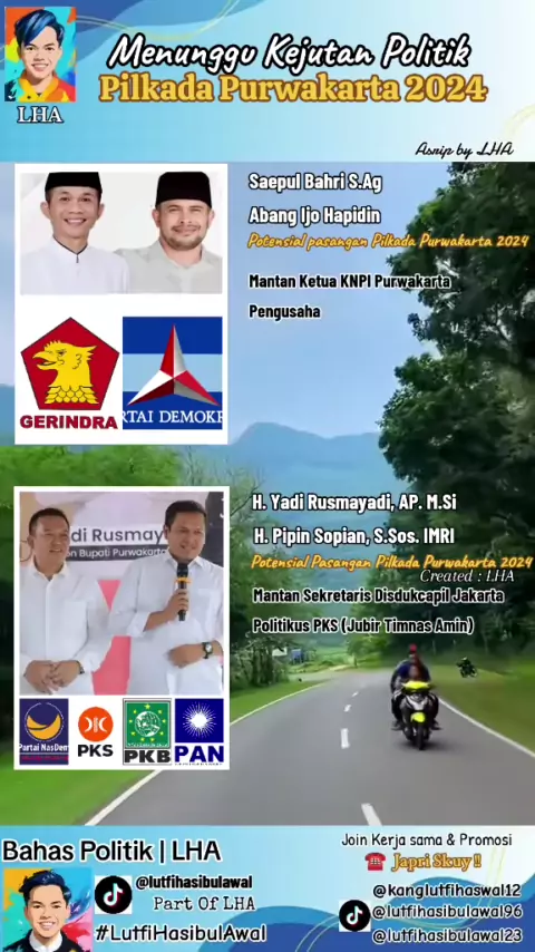 Inilah Potensial pasangan Calon Bupati yang Kemungkinan akan Maju di Pilkada dan dapat Dukungan Partai. akan kah akan ada Kejutan di akhir masa pendaftaran Nanti ? @omzein_saepulbbinzein @panglimataniabangijo @sahabataayofficial @aay_yadi @pkspurwakarta##pilkadaserentak2024#BupatiPurwakarta#PilkadaPurwakarta#purwakarta#Omzein#abangijohapidin#yadirusmayadi#pipinsopian#Gerindra#demokrat#Pks#Nasdem#pkb#pan#kangLutfihaswal#lutfihasibulawal