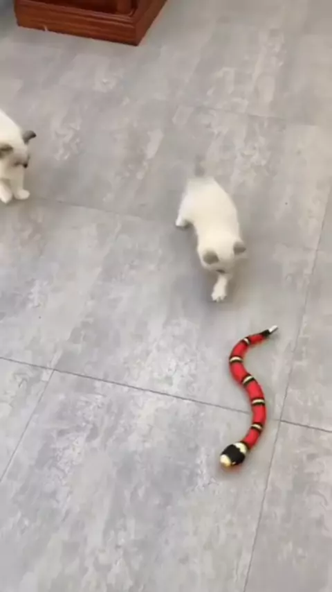 Que fofura esses gatinhos brincando com a cobrinha ๐๐๐mesmo sendo de mentira essa cobra deu um medinho