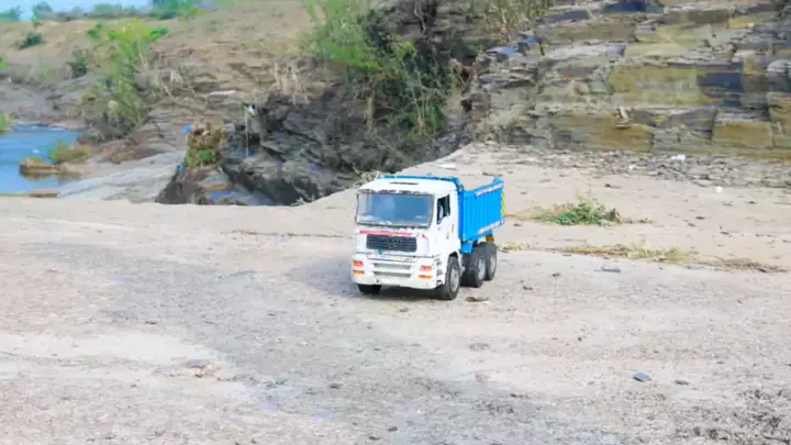 Anak kecil itu menyukai permainan penyelamatan yang menarik dari mobil konstruksi, truk besar dan ekskavator di tepi danau.
