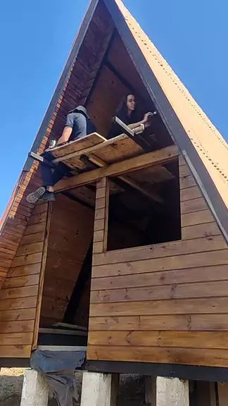 PASSAMOS A SEGUNDA DEMÃO DE VERNIZ NO CHALÉ. #chalé #sitio #cabana