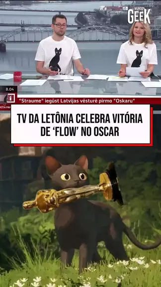 A Letônia está em festa desde que ‘Flow’ venceu o Oscar de Melhor Animação. A vitória foi histórica por ser o primeiro Oscar conquistado no país, assim como ocorreu no Brasil com ‘Ainda Estou Aqui’ em Melhor Filme Internacional. Durante a cobertura da vitória da animação, os apresentadores da LTV vestiram camisetas do gatinho. A logo da emissora ainda foi alterado com a imagem do personagem. 🎥 Reprodução/LTV #flow #straume #oscar #mundogeek