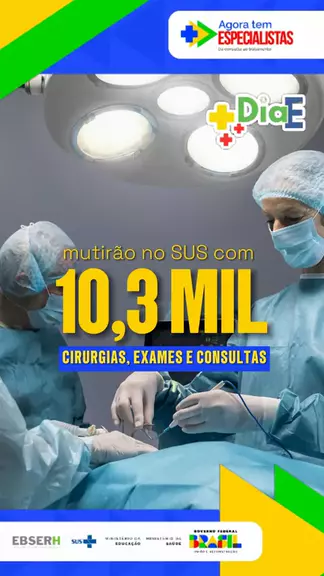 Saúde e Educação somando esforços para levar mais assistência à população no SUS 🤍 👨🏻⚕Neste sábado (5), uma mobilização simultânea em 45 hospitais universitários federais 100% SUS realizará 10,3 mil cirurgias, exames e consultas. Os atendimentos acontecerão em diversos estados durante o Dia E – Ebserh em Ação, mutirão do Agora Tem Especialistas. Saiba mais em gov.br/saude. #DiaD #EbserhEmAção #AgoraTemEspecialistas #Mutirão #SUS