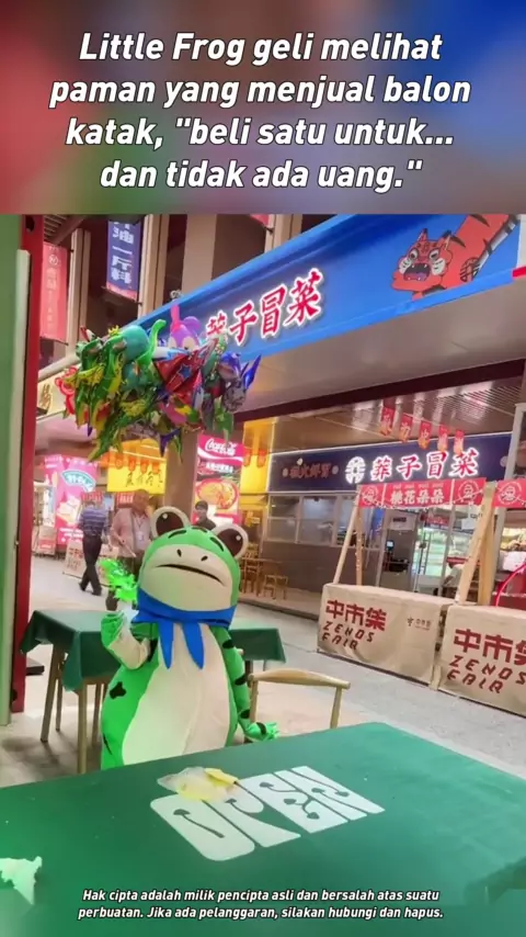 Little Frog melihat paman yang menjual balon katak, "beli satu untuk... untuk uang," dan terhibur oleh beberapa bestie di mie.