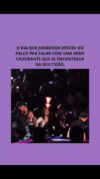 Jungkook enfrentou uma multidão para agradecer uma fã cadeirante. Durante um show do BTS em 2019, ele avistou, do palco, uma fã cadeirante, e sem hesitar pulou a barreira de segurança, atravessando a multidão de Armys para agradecê-la pessoalmente por sua presença especial. A ARMY cadeirante que teve interação com o Jungkook no show do BTS foi Arisha Vendavel, ela deixou seu depoimento no Twister na época. #jungkook #BTS #ARMY