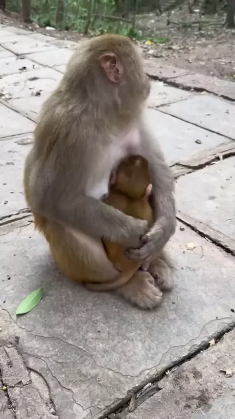 The baby monkey was scared and hid in the mother's lap #cutemonkey #familymonkey