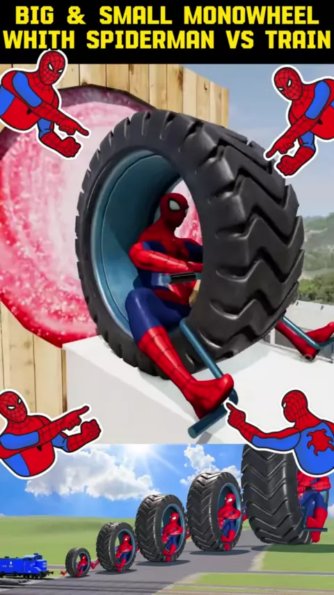 Big & Small Monowheel whith Spiderman vs Train _ BeamNG.Drive 1#BeamNGdrive#cars#Train#cartoy#Toys#big&small#toyracing#Mcqueen#monstertruck#MrQueenDrive#Spidermans#ThomasTrain