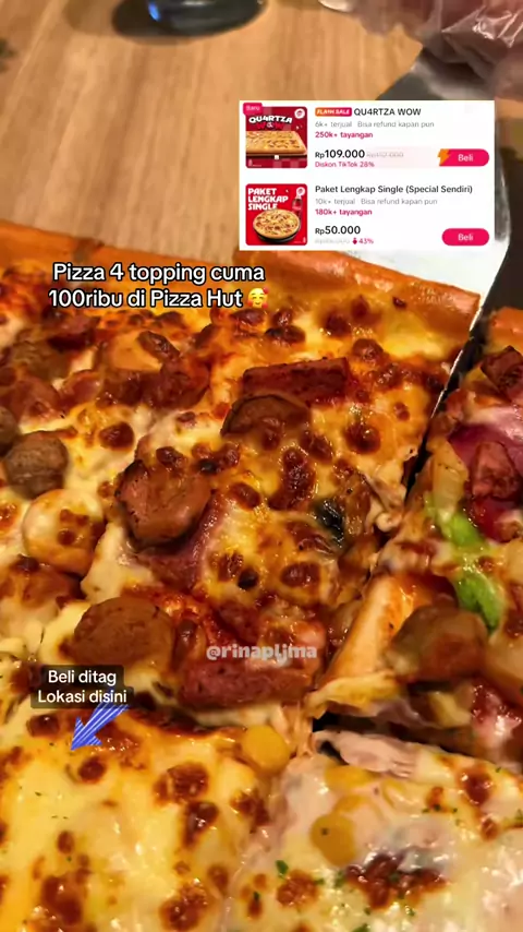 Promo Gajian‼️ Pizza 4 topping cuma 100ribuan loh di Pizza Hut 🥰 Cara belinya : klik tag lokasi dikiri bawah video pilih voucher yg kamu mau, lakukan pembayaran, klo udah transaksi lgsg scan vouchernya dikasir. Voucher ini berlaku diseluruh outlet yg ada dilist keterangan voucher ya.#juaraviraljajan#promoseruweekend#promomakangajian#pizzahut#pizzalover