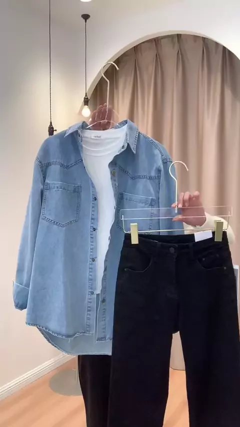 Pakaian musim semi, kemeja denim, dengan lengan pendek putih dan celana lurus hitam, kedua warna itu sangat indah # Dresses with # Fashion wear # Setiap hari memakai dan berbagi