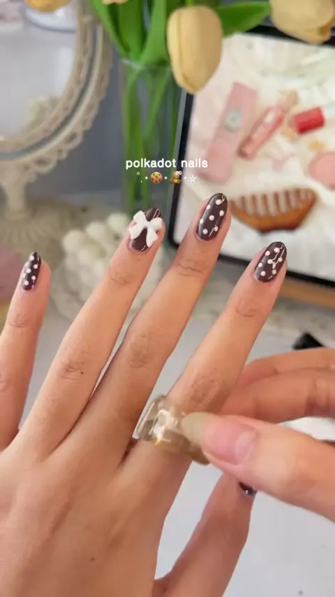 Browny polkadots🍪🧸🛏️ #polkadot #nails #polkadotnails #nailart #nailpolish #nailarttutorial #kutek #nails #brownnails #girlthings