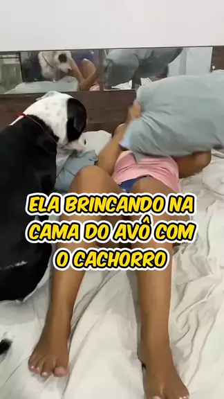 tá brincando na cama com cachorro na cama do avô.
