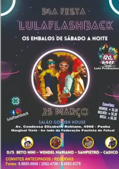 Tá Chegando o Grande Dia‼️ *Sabado 25|Março* Start 22hrs *54° Festa Lula Flashback* "Os Embalos De Sábado a NOite" No *Salão Golden House* Faça sua reserva e venham curtir momentos mágicos que marcaram épocas!! Line Up ➜ *Wendell Mariano* ➜ *Cadico Dee Jay* ➜ *Beto Nini* ➜ *Lucio Sampietro* C.O.N.V.I.T.E.S 🚺🚹 R$50,00 Mesa R$60,00 Informações e Convites Antecipados Lula Produções (11)99805-0000 *Lula Flashback* Onde❓️_ *Golden House* Av. Condessa Elizabeth Robiano,4968 Penha