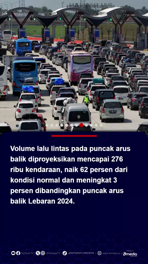 PT Jasa Marga (Persero) Tbk memprediksi puncak arus mudik Lebaran 2025 akan terjadi pada Jumat (28/3/2025). Tanggal tersebut diperkirakan akan jatuh pada H-3 Lebaran dan sehari sebelum Hari Nyepi (H-1). Direktur Utama Jasa Marga Subakti Syukur menjelaskan di puncak arus mudik tersebut, Jasa Marga memperkirakan volume lalu lintas akan mencapai 232 ribu kendaraan. Angka ini menunjukkan peningkatan sebesar 50 persen dibandingkan dengan volume lalu lintas pada kondisi normal.