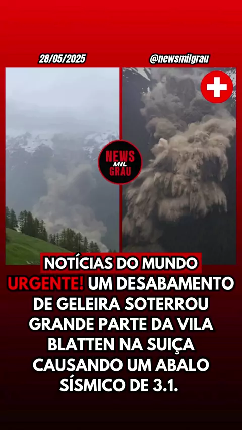 URGENTE!! Desabamento de geleira enterra grande parte da vila suíça de Blatten, causando até mesmo um abalo sísmico de 3.1. Uma gigantesca avalanche de gelo, lama e detritos soterrou grande parte da vila de Blatten, em Lötschental, no Cantão de Valais, após o colapso de uma grande geleira na tarde de quarta-feira. Inúmeras casas foram destruídas. Ninguém ficou ferido. Uma grande parte da Geleira Birch, abaixo da área do deslizamento, que corria risco de desabamento, se desprendeu de uma só
