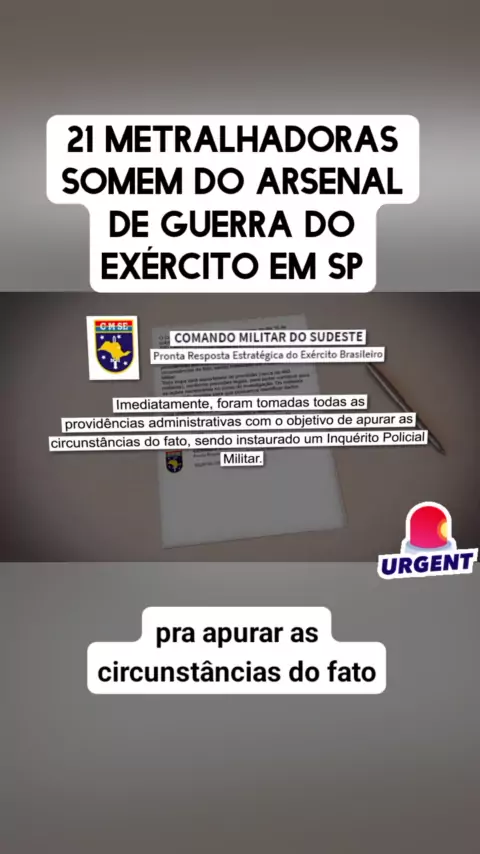 O Exército apura o sumiço de 21 metralhadoras do arsenal de guerra de São Paulo, que fica em Barueri, região metropolitana da capital paulista. Enquanto durarem as investigações para apurar, 480 militares não podem sair da base #provadefogo #historiasnafazenda #diadascrianças #DesafioDeNívelDaFamília #EstrelaDeFamília