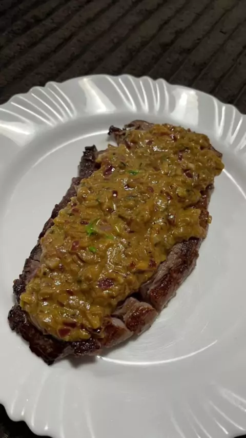 Receita de hoje: Bife ao Molho Mostarda. - - - Modo de preparo na reprodução! - - - Ingredientes: Molho Mostarda • 1/2 Cebola roxa em Brunoise; • 150ml Molho inglês; • 60g Mostarda Dijon; • Cheiro verde à gosto. - - - #Receita #rj #bife #molhomostarda