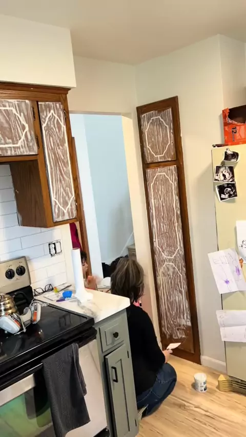 I’ll say it again for the people in the back: i dont hate natural wood! Follow to see me paint these wood cabinets 🥰#kitchenreno#budgetrenovation#diymom#pregnant
