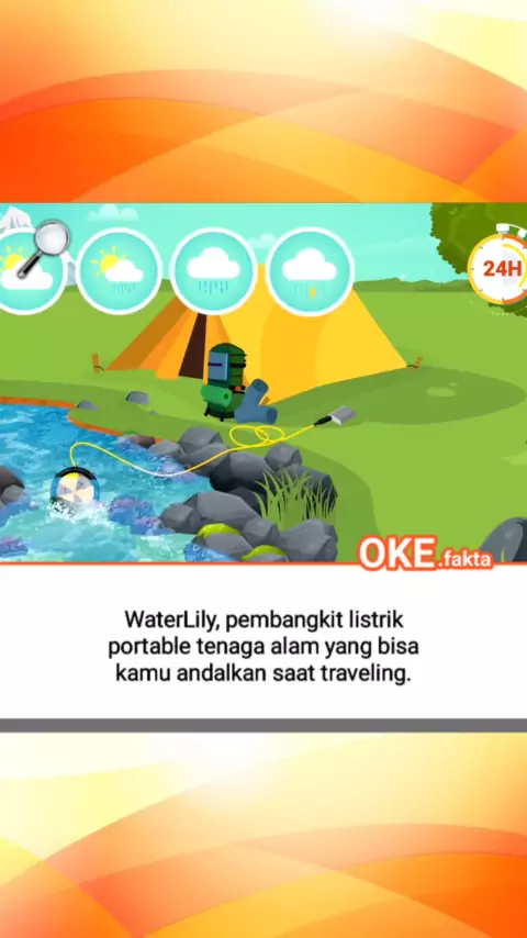 Membawa powerbank merupakan alternatif, tetapi pada akhirnya powerbank pun akan kehabisan dayanya sehingga smartphone tidak memiliki cadangan energi. Sebuah generator portabel yang dapat diandalkan untuk memasok listrik dengan memanfaatkan potensi alam sekitar. Pembangkit listrik portable terbaru bernama Waterlily dibekali turbin yang mampu mengalokasikan energi dari aliran air dan tiupan angin. Waterlily diameter 180 milimeter dengan berat 800 gram. #okefakta