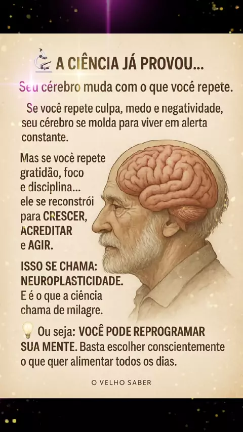 🔬🧠 A Ciência já provou… Seu cérebro muda com o que você repete. Se você repete culpa, medo e negatividade, seu cérebro se molda para viver em alerta constante. Mas se você repete gratidão, foco e disciplina… ele se reconstrói para crescer, acreditar e agir. Isso se chama: neuroplasticidade. E é o que a ciência chama de milagre. 💡 Ou seja: Você pode reprogramar sua mente. Basta escolher conscientemente o que quer alimentar todos os dias. — #OVelhoSaber #CiênciaDaMente #PoderDoCérebro