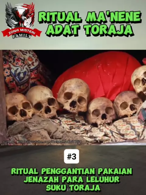 Ritual Ma'nene adalah ritual tradisional di Tana Toraja dimana jenazah leluhur keluarga Toraja akan dibersihkan, digantikan baju dan kainnya. Ma' Nene' merupakan sebuah ritual adat dalam budaya Suku Toraja. Part 3 sumber : https://youtube.com/@cintatradisi1753 #misteridisnack #viralinkuy