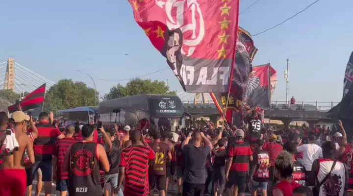 ÔNIBUS DO FLAMENGO CHEGOU! QUE FESTA! ISSO É AEROFLA! TORCEDOR EM CIMA DO ÔNIBUS! PELA CLASSIFICAÇÃO! 📸 @__perdigao | Equipe @paparazzorubronegro #Flamengo #VamosFlamengo #CRF #MaisQuerido #AcimadeTudoRubroNegro