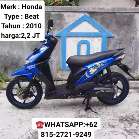 بِسْــــــــــــــــــمِ اللهِ الرَّحْمَنِ الرَّحِيْمِ Merk : Honda Type : Beat Tahun : 2010 Cc : 110 Tranmisi : A/T (Matic) Bahan bakar : Bensin ○ Dokumen - Surat2 komplit BPKB,STNK,FAKTUR - Asli AB - Pajak Hidup ○ Kondisi - Terawat bersih dan rapi - Body Utuh Orisinil - Indikator normal - Kelistrikan normal - Spedo normal - Mesin Terawat, tarikan enteng - Starter juga oke - Ban2 Tebal - Tinggal Pakai harga:2,200.000 JT Hub/WA :.+62 815-2721-9249