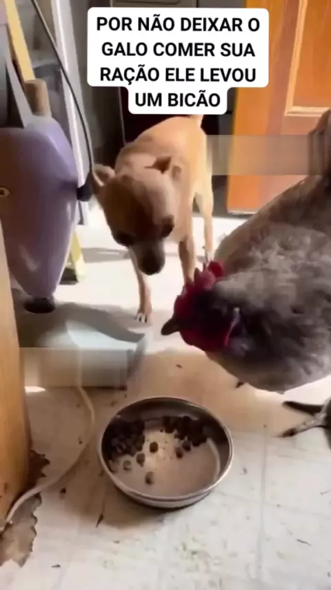 O cachorro reclamou do galo porque está comendo a sua comida o galo simplesmente deu um bicão nele #pets #animais #entretenimento #viral #pets