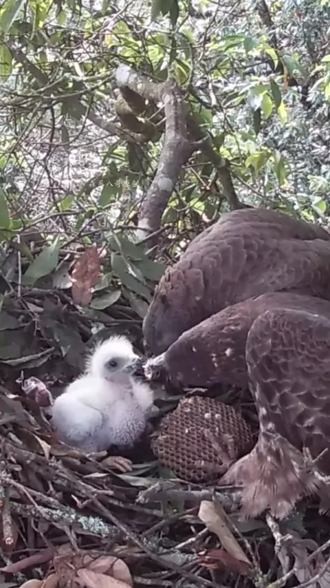 A águia mãe alimentou o bebê com a pupa da abelha e levou a colmeia embora depois de alimentá-la.
