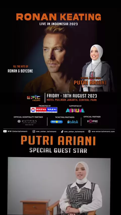 It's Gonna Be EPIC !! π EPIC Friday proudly presents RONAN KEATING Once in a Lifetime experience π The lead singer of BOYZONE Duet with Me Putri Ariani Be sure to secure your tickets and book an exclusive Meet & Greet Click link on @ww_enter_tainment bio for tickets! Presented to you by @ww_enter_tainment Supported by @colorasialive with Official hospitality partner @pullmanjakartacp Voffice partner @voffice #warnawarnientertainment #colorasialive #RonanKeating #putriariani