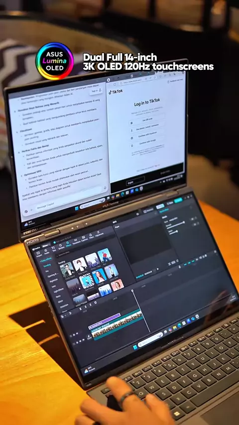 Laptop AI Dual Screen yang tipis, ringan tapi canggih ! ASUS Zenbook DUO (UX8406CA) Multitasking enak, buat kerja enak, spek gahar bisa di pake apapun sampe gaming pastinya. Laptop yang di bekali Intel® Core™ Ultra 9 dengan performa AI Boost NPU yang terbaik di jajaran laptop ASUS Design Premium dan berstandard military grade. fitur ASUS AI, seperti fitur Copilot, ASUS AiSense Camera with Windows Studio Effects, dan ASUS AI Noise-Cancellation. Layar cakep, baterai awet sampe 13 jam, port nya ba...