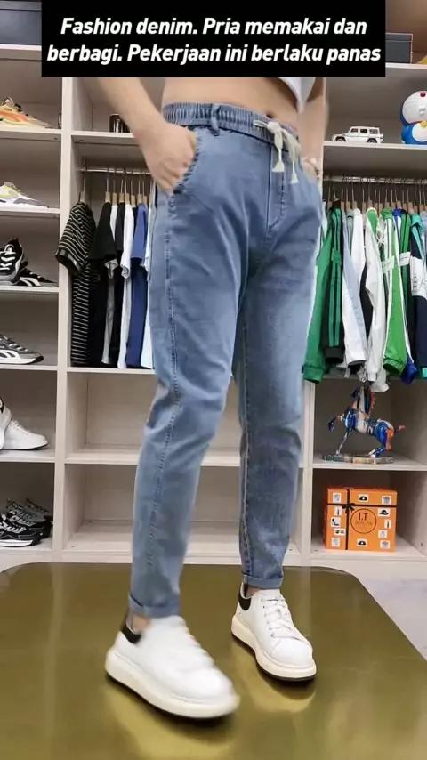 Fashion denim. Pria memakai dan berbagi. Pekerjaan ini berlaku panas