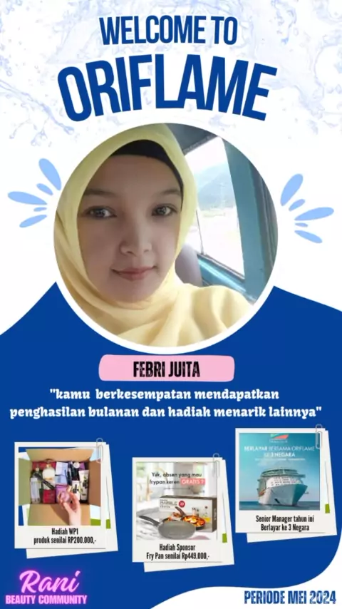Selamat bergabung di Oriflame bersama jaringan Rani mba Febrijuita Mba berasal dari Sumatera Barat🤗 Bergabung Oriflame bulan ini banyak keuntunganya yg bisa mb dptkan 💛Hadiah WP1 berupa 1 produk gratis senilai 200ribu 💛Hadiah LocknLock Frypan senilai 449ribu Gratis 💛Jadilah Senior Manager Oriflame tahun ini untuk mendptkan perjalanan liburan berlayar bersama oriflame ke 3 Negara 💛Bonus bulanan tak terbatas ,makin rajin ngerjain bisnisnya bonusnya makin besar😍 Semangat memulai bisnisny