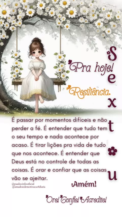 Resiliência: A Força da Fé "Resiliência é passar por momentos difíceis e não perder a fé. É entender que tudo tem o seu tempo e nada acontece por acaso. É tirar lições para a vida de tudo que nos acontece. É entender que Deus está no controle de todas as coisas. É orar e confiar que as coisas vão se ajeitar. 🙏✨💪 Um lindo dia para vocês. 😘❤ Contas 👇🏻 @umadosedemotivacao8diaria #umadosedemotivacao8diaria #Resiliência #Fé #Esperança #DeusNoControle