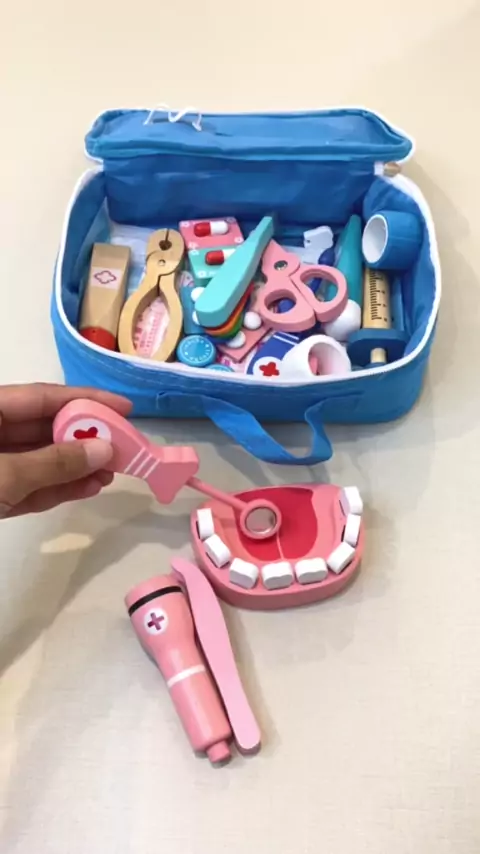link on bio no 53. doctor toy set mainan dokter gigi anak, berbahan kayu halus sehinggal aman untuk di mainkan anak anak, isi keengkapan sperti di video ada 22pcs. pilihan tas biru dan merah #mainananak #mainanedukasi #jualmainan #mainandokterdokteran #mainandoktergigi #gingerinfant #idebermaingingerinfant #woodentoys
