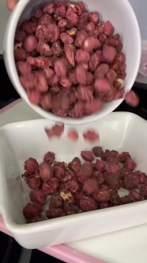 Essa receita de praline é maravilhosa. 250 gramas de amendoim com casca 1 1/2 xícara de açúcar 1 xícara de água 1 colher(de café) de fermento em pó Eu usei. 1/2 colher(de café) de corante vermelho Mais vc pode colocar chocolate em pó! #praliné #receitasimples #sobremesa #gastronomia #SouMulher