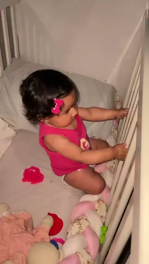 seis meses da Ayla e está está assim 😂 ficando em pé no berço