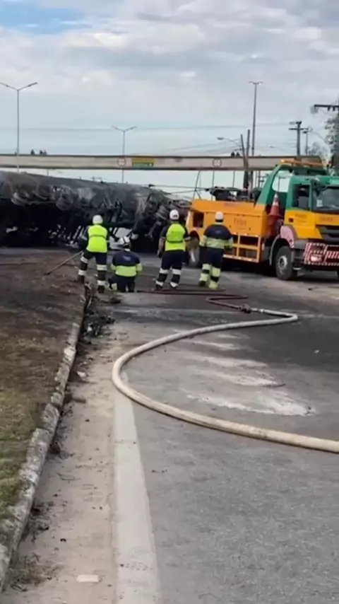 #Manilha em #itaborai Bombeiros atuando no controle do caminhão de combustíveis que tombou no Trevo de Manilha nessa madrugada. Estava aparente controlado, e nesse exato momento o f4go reacendeu!! Crédito Itaboraí em foco